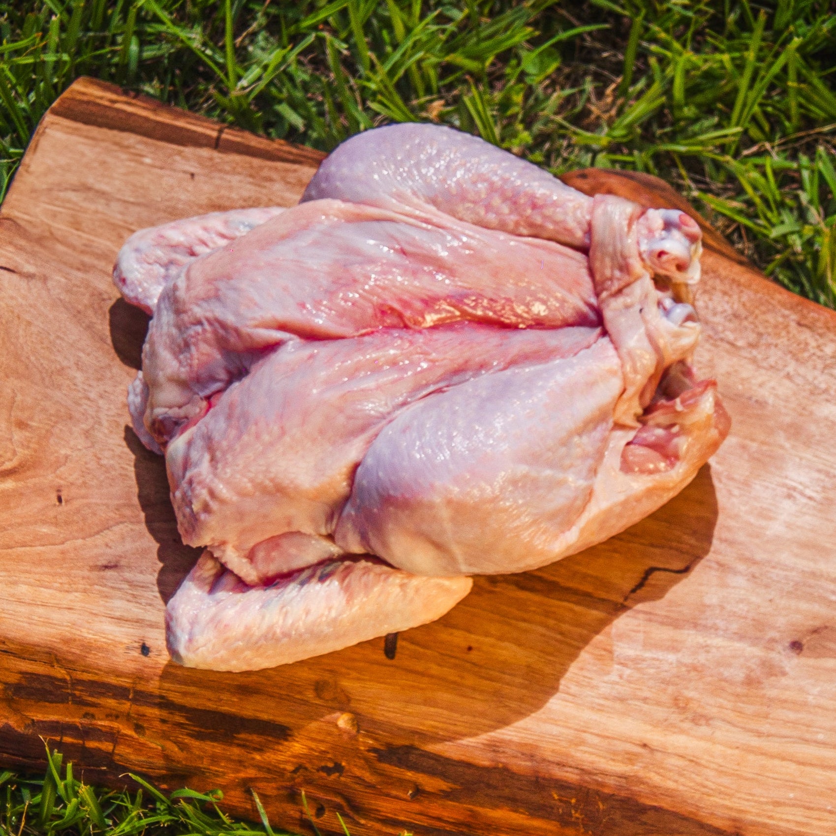 All of our chicken is pasture raised and moved daily to fresh pasture. We supplement them with a Non GMO feed ration that contains Corn and Soy.